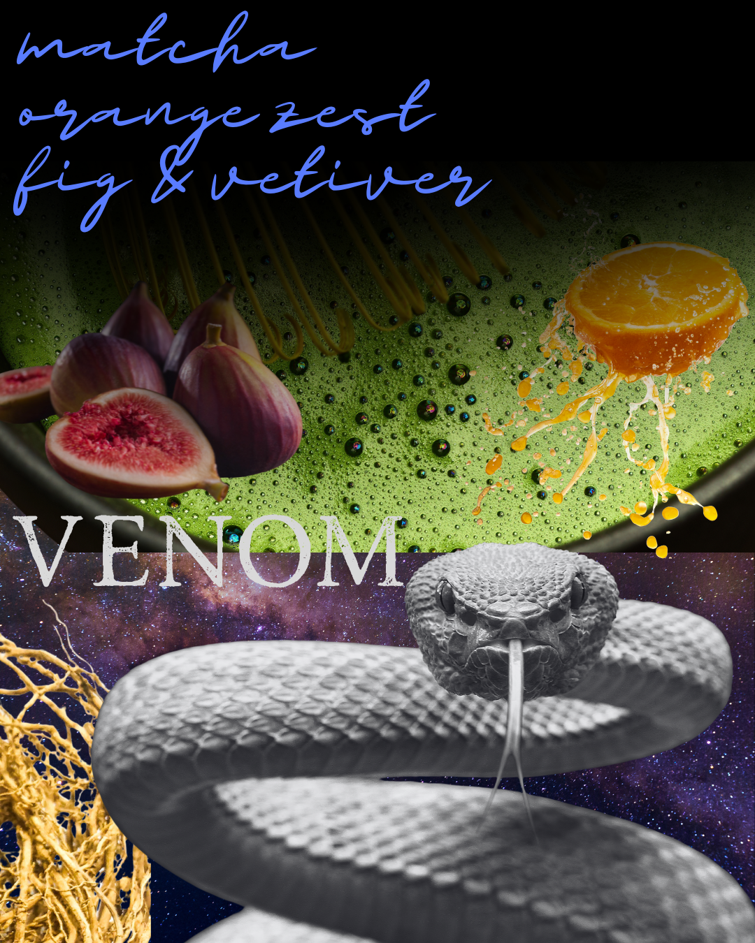 VENOMStone-ground matcha powder, Sparkling citrus essence, Earth-steeped vetiver root